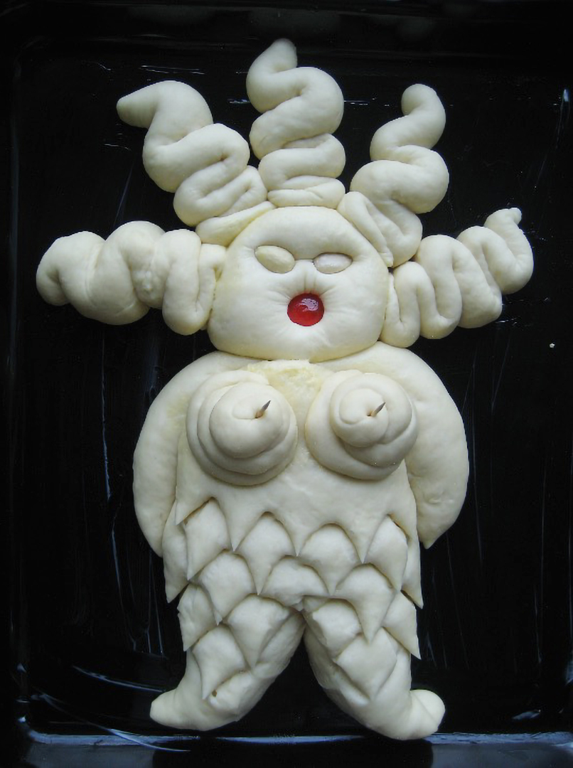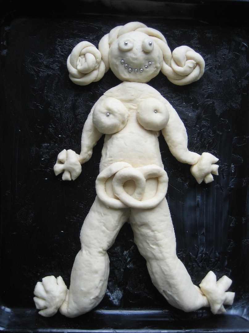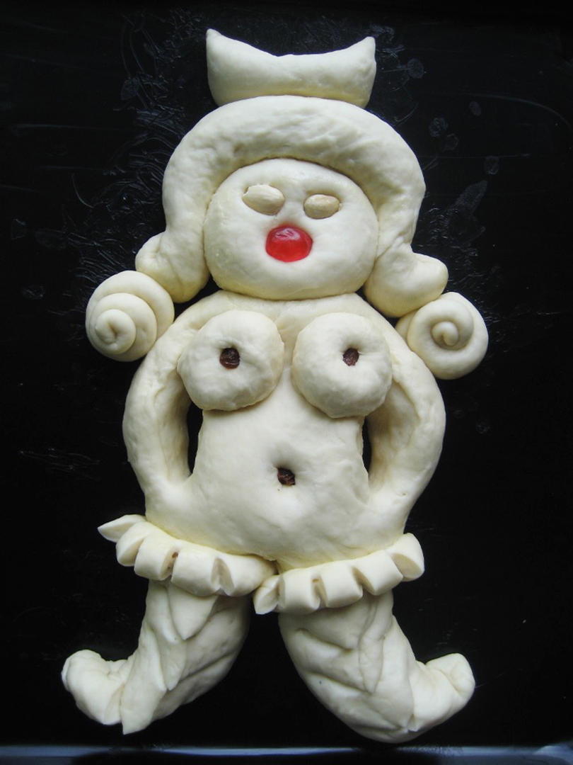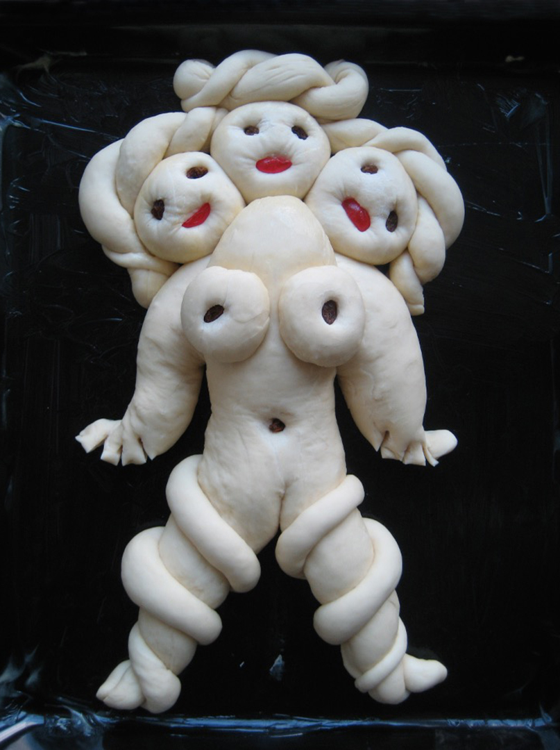 Dedications è una performance lunga un anno: un ritorno alle origini, un gesto quotidiano che diventa rito. Pane al latte modellato a mano, senza progetto, seguendo solo l'istinto: la pasta che lievita, si espande, si lascia tagliare e plasmare fino a diventare corpo femminile. Occhi di mandorla, bocche di ciliegie candite, segni d'uva sultanina. Figure nate dal calore della terra e restituite al calore del forno.