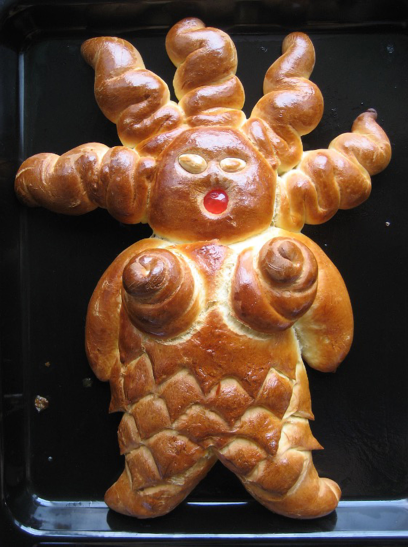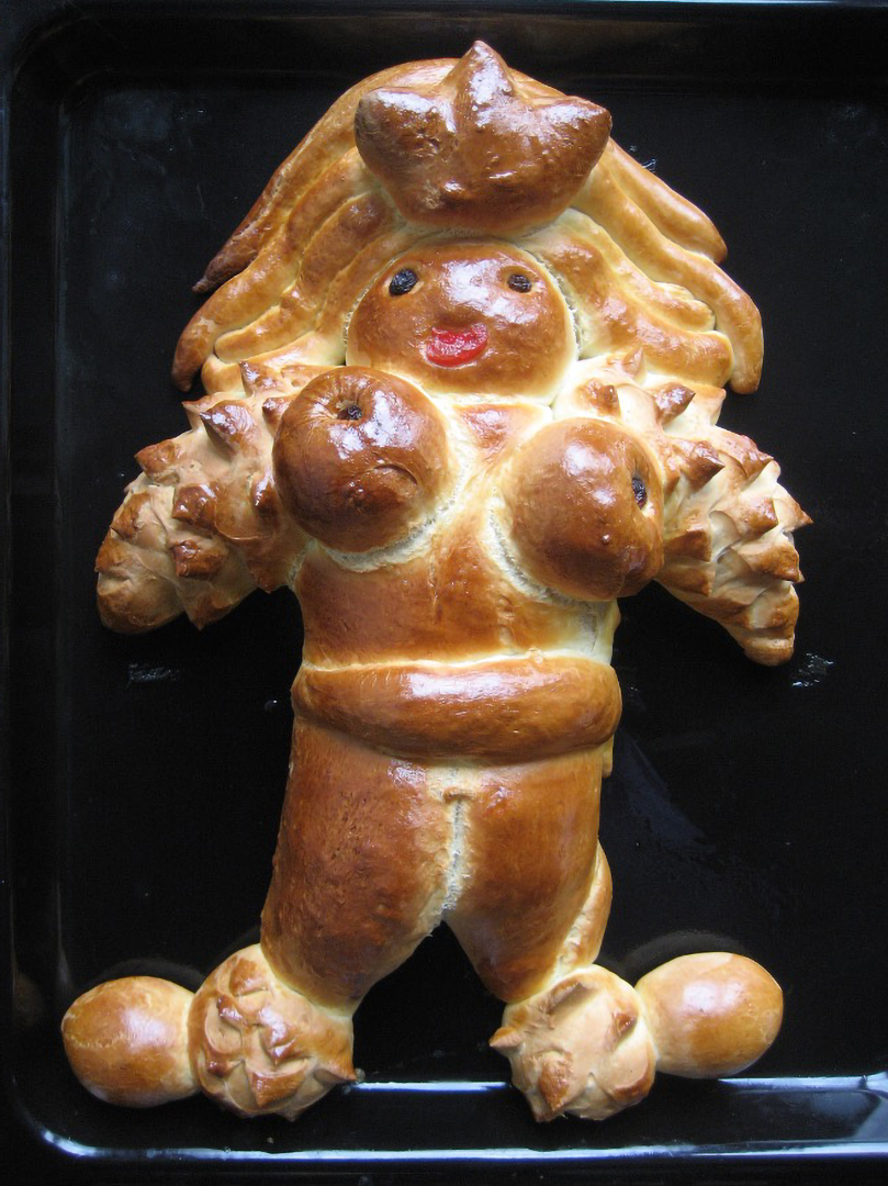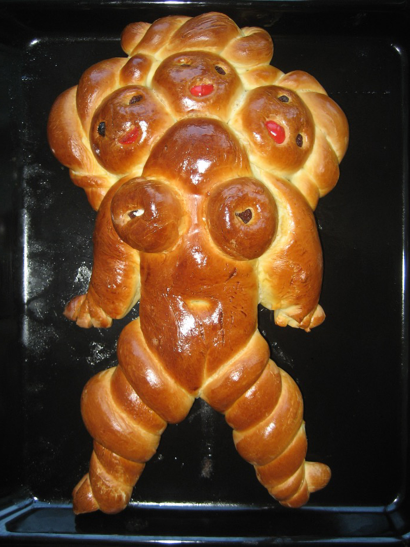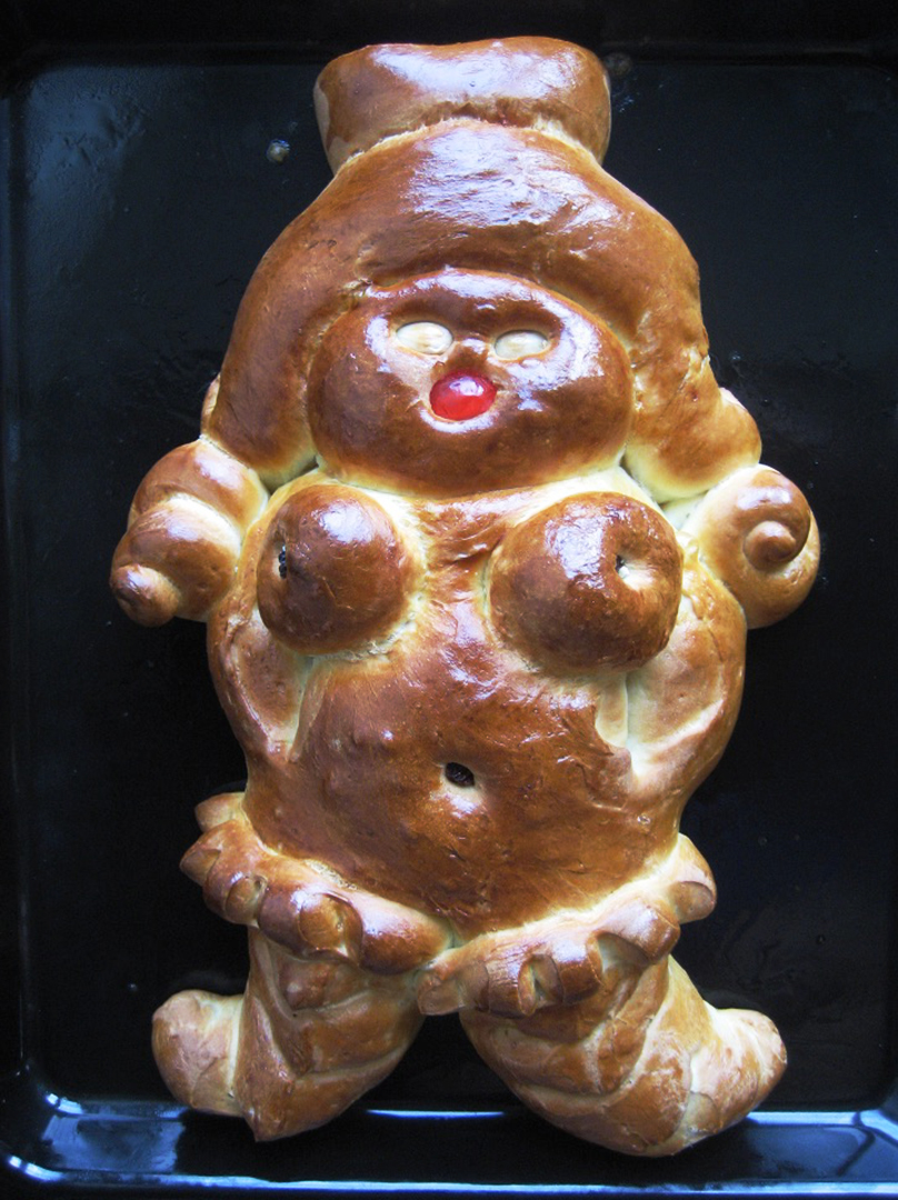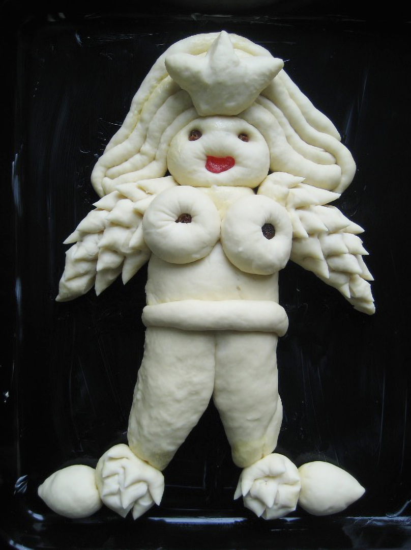 Dedications è una performance lunga un anno: un ritorno alle origini, un gesto quotidiano che diventa rito. Pane al latte modellato a mano, senza progetto, seguendo solo l'istinto: la pasta che lievita, si espande, si lascia tagliare e plasmare fino a diventare corpo femminile. Occhi di mandorla, bocche di ciliegie candite, segni d'uva sultanina. Figure nate dal calore della terra e restituite al calore del forno.