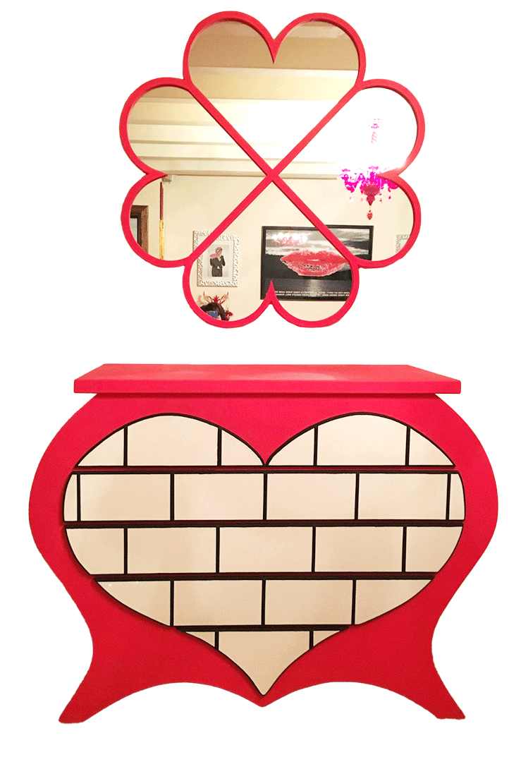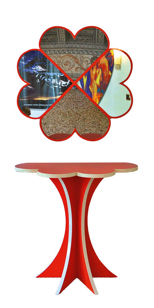 Gli specchi sono composti da diverse parti geometriche, disposte in modo convesso; le consolle ne rappresentano la metà, come lo stesso oggetto ribaltato in orizzontale. Verticale e orizzontale dialogano: ciò che riflette e ciò che sostiene.