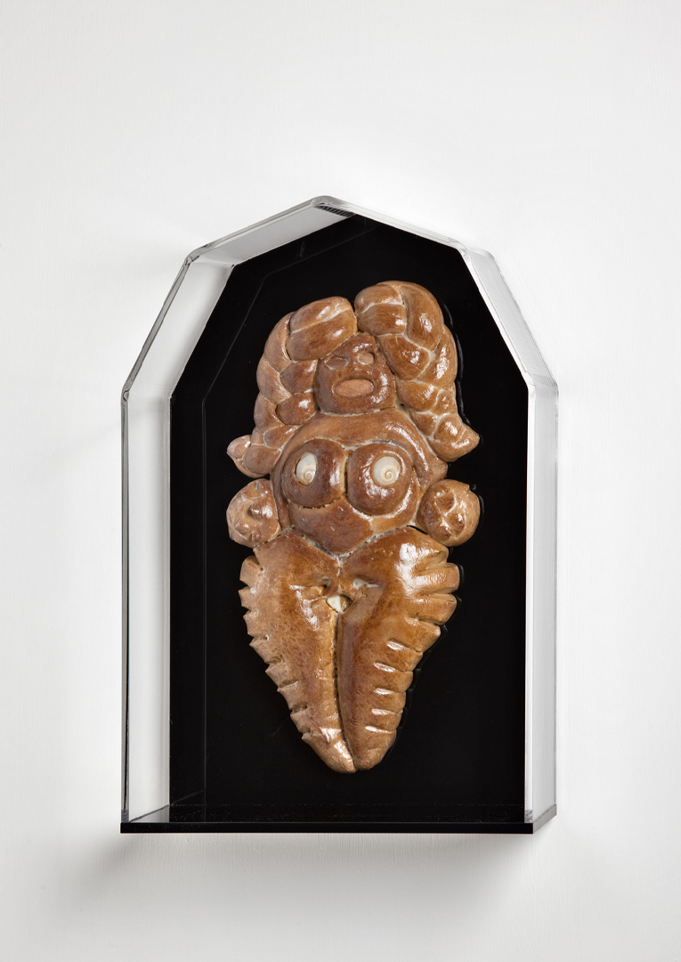 I titoli delle opere — Izanami, Nut, Loreley, Shekina — evocano figure femminili della fecondità e della trasformazione, dee e spiriti provenienti da tradizioni lontanissime tra loro. Attraverso il pane, alimento primario e universale, questi archetipi diventano presenze tangibili, sospese tra la fragilità della materia organica e la solennità del culto. Ogni scultura è un piccolo gesto di resurrezione simbolica: il pane, che biblicamente nasce per morire, viene qui sottratto alla sua fine naturale e reso duraturo, protetto, contemplabile.